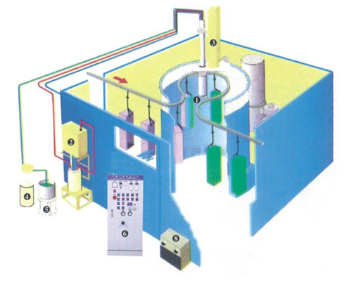 圆盘型安装实例:1. 圆盘2. 高压产生器3. 往复机4. 涂料桶5. 涂料供给装置6. 操作控制箱7. 空气管、涂料管、高压管8. 冷冻干燥机