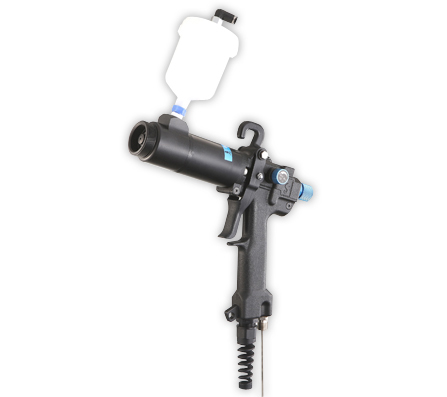 This air-based manual electrostatic spray gun requires a high-voltage electrostatic generator, a pressurized coating material feeding device (pressure pump, pressure tank, etc.), and an electrostatic nozzle.